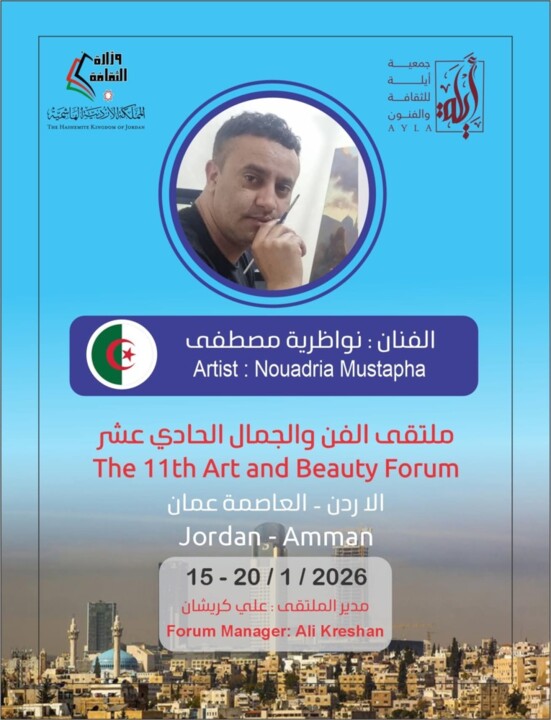 I am pleased to announce that I have been invited to participate in the international Art and Beauty Forum, scheduled to be held in the Jordanian capital, Amman, from January 15 to 20, 2026.Nature of the Forum: This forum is a comprehensive artistic and cultural gathering that attracts a selection of visual artists and creators from various Arab and international countries, providing a platform for presenting artwork and holding specialized workshops and seminars.My Core Participation Objectives: My involvement in the forum centers around achieving three essential dimensions:Direct Interaction and Experience Exchange: The ultimate goal is direct engagement with artists from diverse artistic schools and backgrounds. This is a valuable opportunity to exchange ideas and discuss professional and personal experiences in the art world, which will enrich my own artistic vision.Self-Development and Knowledge Sharing: I aspire to share my artistic journey and present my unique vision. In turn, I look forward to benefiting from others' expertise in utilizing modern techniques and learning about contemporary artistic trends, contributing to the refinement of my skills and the development of my creative style.Exploring Cultural Jordan: Participation is not limited to the artistic aspect alone; it is also a chance to explore the Hashemite Kingdom of Jordan, to get acquainted with Amman as a cultural and historical capital, and to visit the archaeological and scenic sites that will serve as a new source of inspiration for my future work.In short, I view this participation as an important step towards fostering international artistic communication, enriching my intellectual and practical knowledge, and returning with new artistic and cultural experiences.