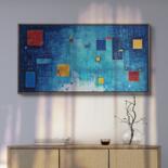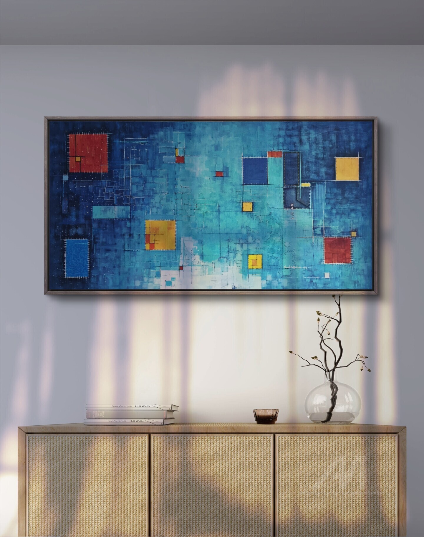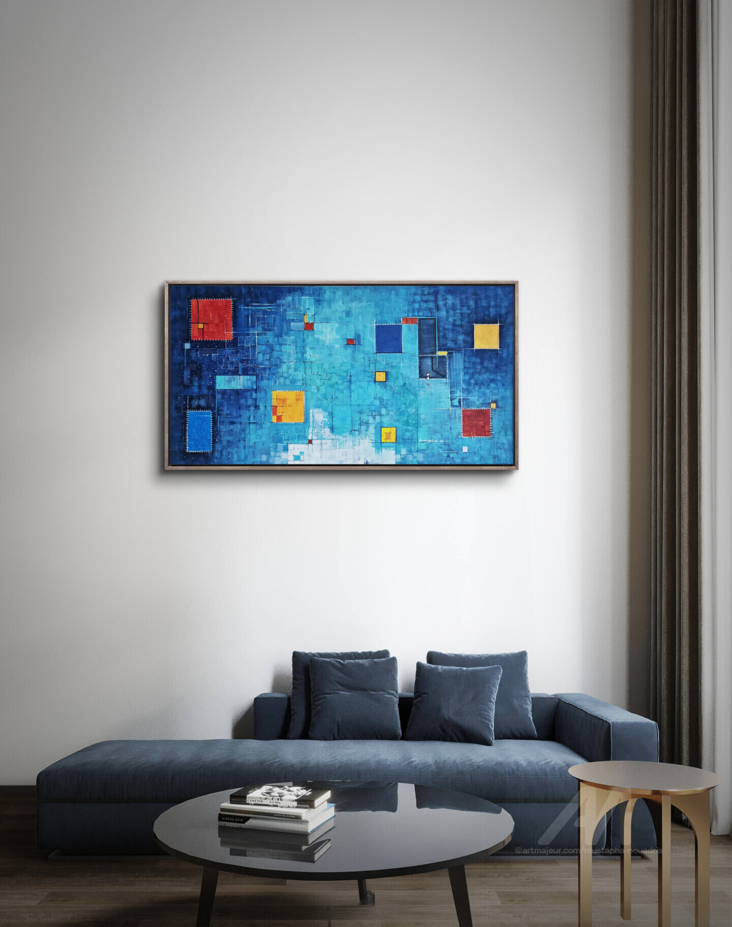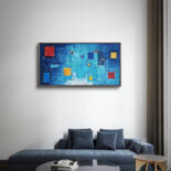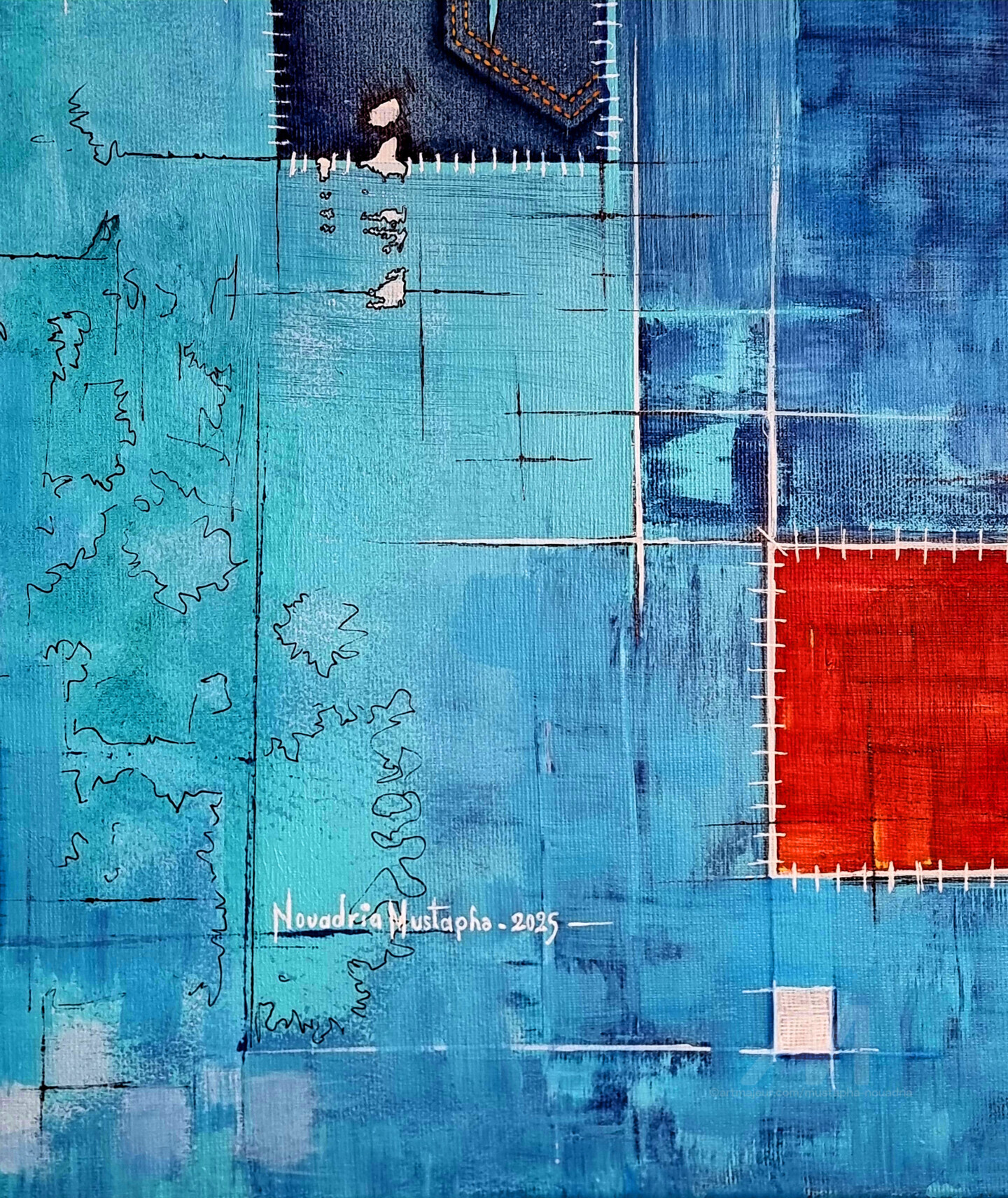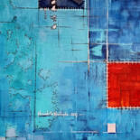 This piece is an intense exploration of the relationship between depth and surface, and the balance between chaos and order. The artwork is dominated by various shades of blue, ranging from deep, dark midnight blue to lighter turquoise, evoking a sense of a complex labyrinth or a submerged, ethereal map